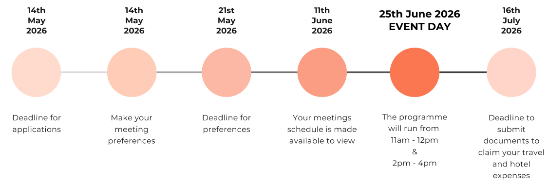 The meetings will be 15 minutes long and held between 11:00 and 16:00 on the event day (25th June 2026) in the hosted meetings lounge.